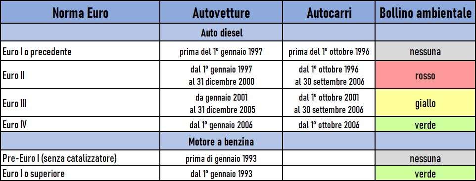 Puoi scoprire facilmente che tipo di bollino ambientale otterrai per il tuo veicolo nella seguente tabella riassuntiva. (I livelli Euro rappresentano la direttiva sulle emissioni emanata dalla EEC/EC come riportata nella tua carta di circolazione.)