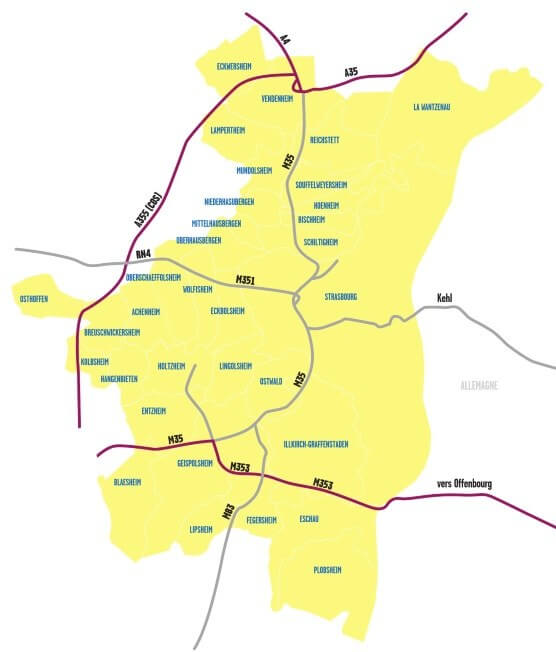 La zona a basse emissioni di Strasburgo comprende tutti i 33 comuni della regione. Le restrizioni non si applicano alle strade principali A4, A35, N83, N353 e D1083.